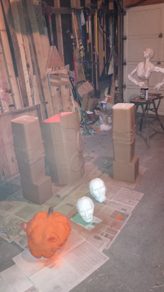 Here’s a good shot of Tiki, new paper heads, a paper mache pumpkin, and female torso (in paper) being painted.