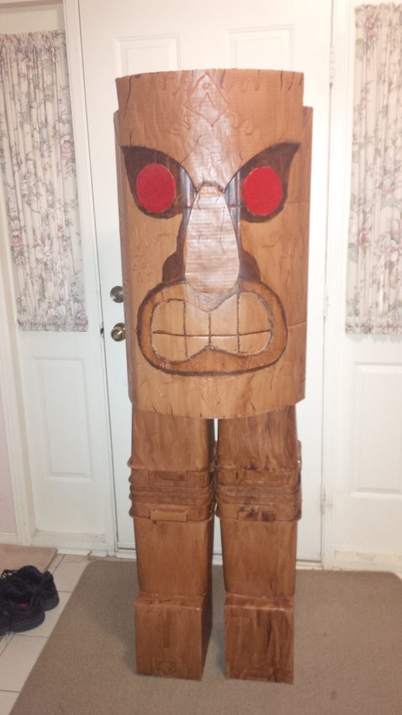 Meet the new guy, Tiki. The body is cardboard, and the legs are made from plastic kitty-litter containers.