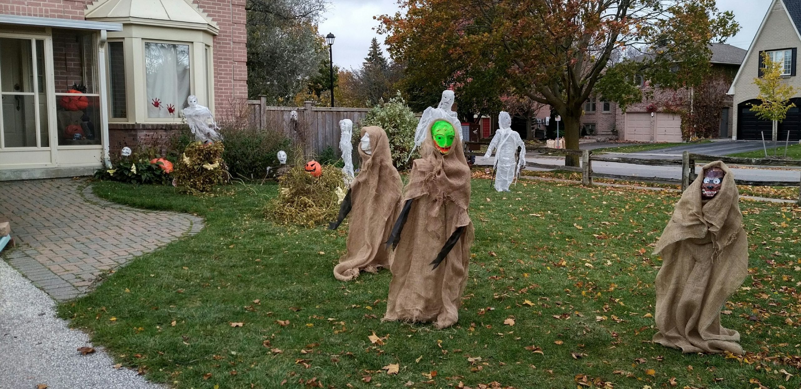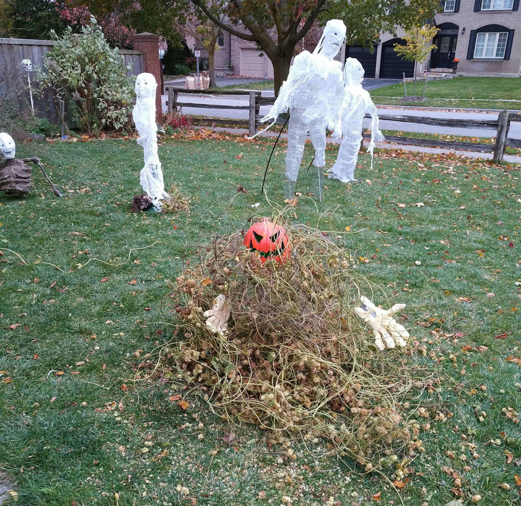 The lawn figures. The lumpish thing in the foreground is a pile of dry hop vines wrapped around a wire tomato cage.
